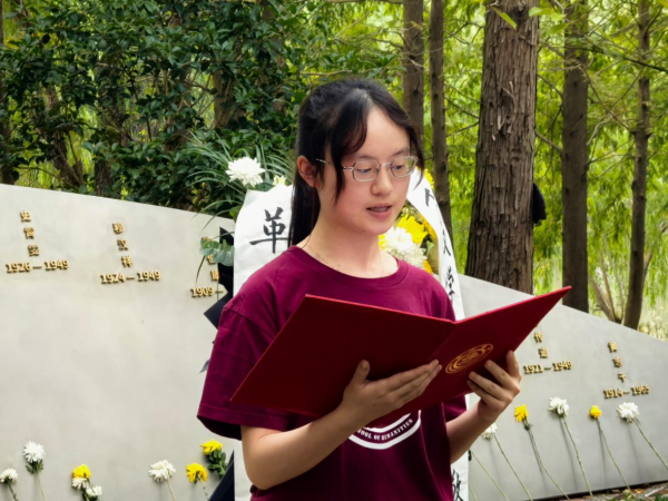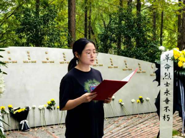 博士生第一党支部书记彭湘君深情讲述了杨大雄、史霄雯、穆汉祥等烈士的感人事迹,表达了对先辈的崇高敬意,并呼吁同学们继承先烈遗志,珍惜韶华,挺膺担当,将青春力量奉献给强国建设的伟大事业。